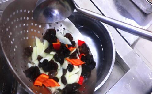 4.锅内烧水、大火烧开以后,倒入沥干水分的山药和木耳,快速焯水30秒钟,再放入红椒片稍微汆一下倒出来,并用凉水冲洗降温,避免食材回软、失去脆嫩的口感。这一步一是为了让食材更容易炒熟,二是能够把木耳中多余的水分释放出来,避免炒的时候冷水遇到热油 而炸锅。