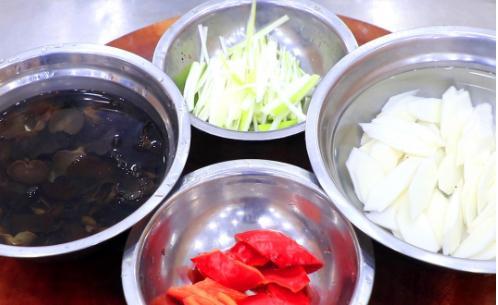 2.木耳提前用凉水浸泡2个小时,充分泡涨发,吸饱水分的木耳,炒的时候不会因为受热膨胀而炸锅。半个红椒,切成菱形片用来搭配颜色;再准备一根大葱,切成葱丝备用。
