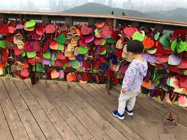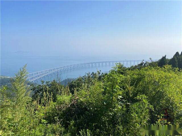 上山沿途可见木栏上挂着一个个彩色的许愿牌,上面都是每个人最美好的祈愿,在阵阵海风的吹拂下,许愿牌之间相互碰撞,发出了清脆的木牌的声音,每一次碰撞,都像重复一次牌上的语句,更像是人与人之间的相互祝福。右手边可看到那一望无垠,接连蓝天的蔚蓝大海,还有那条建在海上的跨海大桥,就如一条白丝绸飘着。