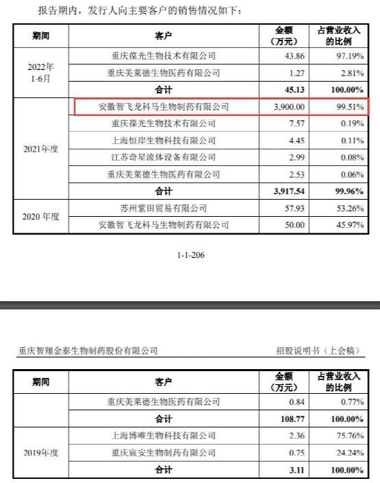 招股书显示,2020年、2021年,安徽智飞龙科马生物制药有限公司分别为智翔金泰的第二大客户、第一大客户,智翔金泰向其销售金额分别为50万元、3,900万元,占营业收入比例分别为45.97%、99.51%。安徽智飞龙科马生物制药有限公司为智飞生物的全资子公司。