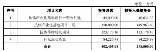 智翔金泰此次拟在上交所科创板发行的股票数量为9168万股,拟募集资金39.8亿元,分别用于抗体产业化基地项目一期改扩建、抗体产业化基地项目二期、抗体药物研发项目、补充流动资金。