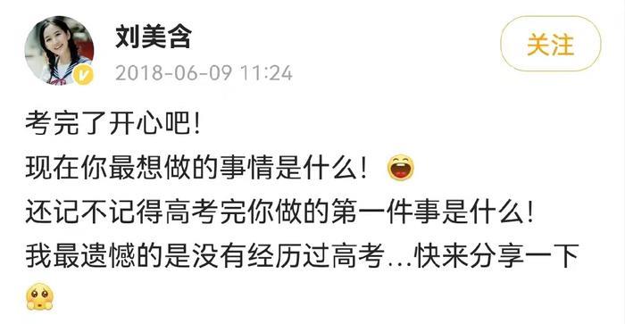 当时的刘美含刚好遇上高中毕业,在高考那一年同时获得了北外和武大的保送,她最终选择了北外,攻读日语系。因为保送是不用高考的,为此她还在微博上表示自己最遗憾的就是没能经历过高考(一点凡尔赛发言罢了)