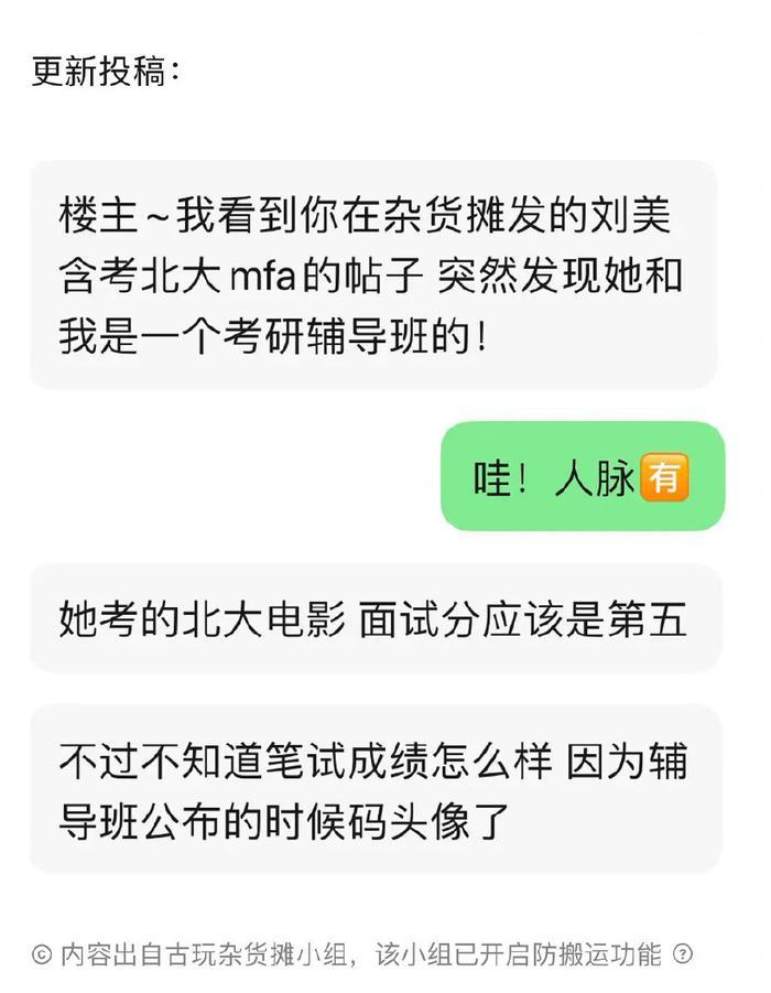 有网友爆料称自己和刘美含在一个辅导班上课,称刘美含考的学校是北大电影,面试分应该是第五
