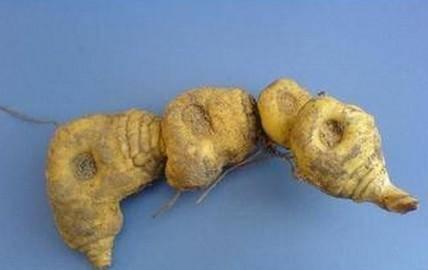 姜形黄精:呈长条结节块状,长短不等,常数个块状结节相连。表面灰黄色或黄褐色,粗糙,结节上侧有突出的圆盘状茎痕,直径0.8~1.5cm。