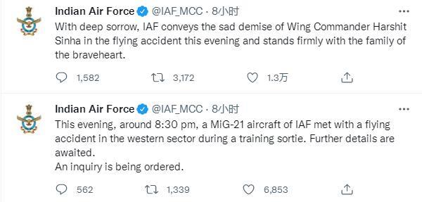 《印度斯坦时报》则补充道,这已经是今年印度空军坠毁的第5架米格-21战斗机,自年初以来已有3名印军飞行员死于该机的坠毁事故。而自从1963年接收到首架战斗机至今,印度空军已经引入了874架改进型米格-21战斗机,其中超过60%是印度本国在获得许可的情况下生产的。然而在过去的近60年时间里,已有超过400多架米格-21战斗机坠毁,导致超过200名印军飞行员丧生,而该机由此获得了“飞行棺材”、“寡妇制造者”等负面称号。