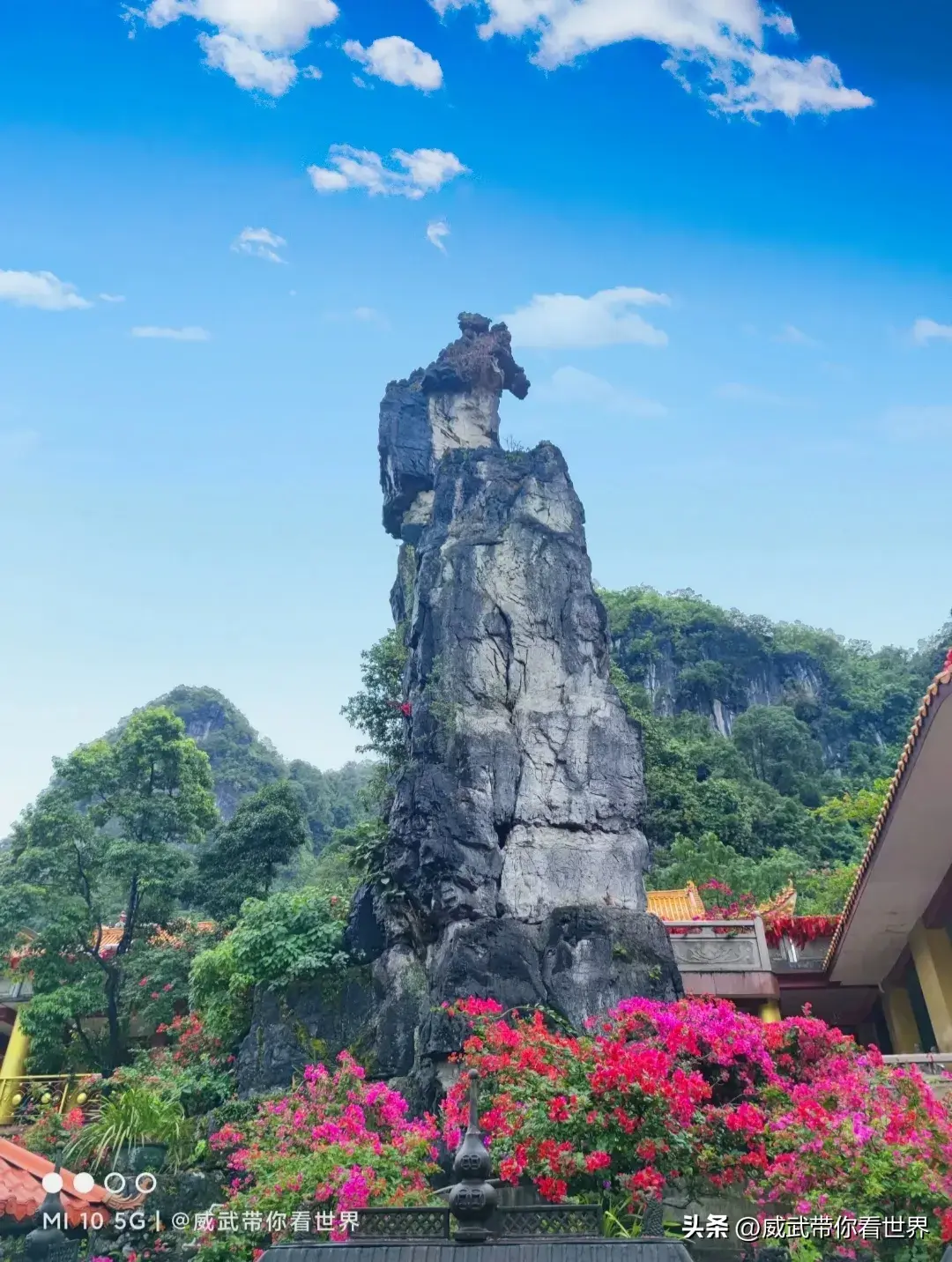 ★游玩路线攻略:进入景区可以先前往普陀寺烧香拜佛求愿。弄拉普陀寺坐落于弄拉金刚山上,寺庙始建于光绪甲申年(1904年),翻修于2007年,由原来面积的500多平方米,扩建到现在的13700多平方米。如今基本已经翻修完成,整座寺庙依山而建,高达十几层楼那么高。寺中有大雄宝殿、观音殿、地藏殿、天王殿、弥勒殿、钟楼、鼓楼等等,整座建筑设计精巧,造型庄严,雄伟壮观。寺庙周围山峰自然形成的天降韦驮,护寺神虎,金刚大鹏鸟,达摩诵经,点悟石柱等等天然景观,富有神秘色彩,吸引了众多信徒和游客慕名前来朝拜,堪称灵山圣地。头条关注@威武带你看世界