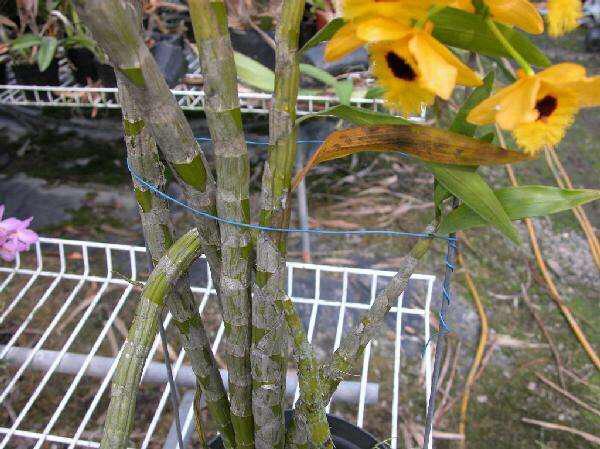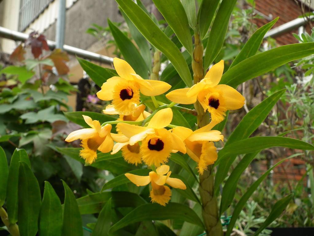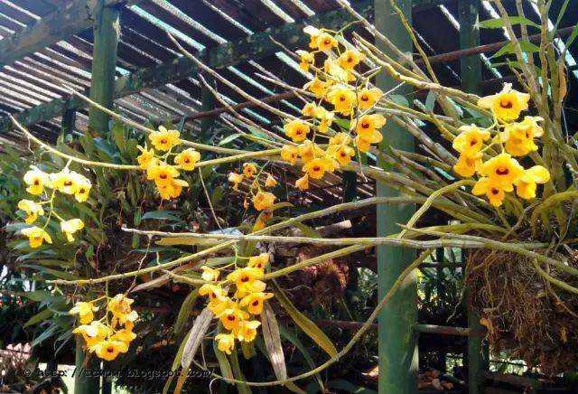 原形态茎直立,圆柱形,绿色,在阳光充足地方带红紫色,具沟槽,高30~122cm,粗0.6~1.2cm。叶薄革质,长椭圆形,长9~12cm,宽2~4.5cm,顶端急尖或渐尖。总状花序生于无叶茎的先端,下垂,有花5~8朵;花金黄色,有香气;萼片长约2.5cm,宽1.2~1.5cm;花瓣与萼片等长,但较宽,宽1.5~1.7cm,唇瓣近圆形,长2.5~3cm,宽2.5~2.8cm,唇盘上有1个肾形紫色斑块,两面均有绒毛。花期4~5月。