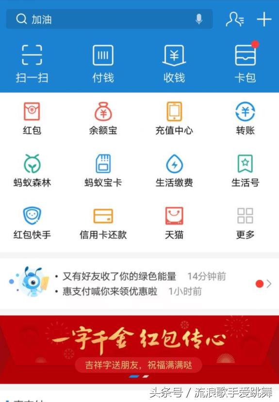 打开支付宝首页你将看见中间红色部分几个醒目的大字:一字千金,红包传心