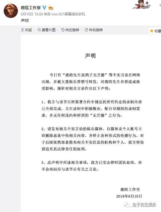 昨日,鹿晗被指责无故推掉《这就是对唱》导师工作的录制,《对唱》节目组官方微博也晒出将由张韶涵来顶替鹿晗这一期的录制。之后有消息称该节目组的导演发朋友圈,指出被某明星放鸽子,罢录节目,只是因为为了陪女朋友。对此,鹿晗工作室已经发出声明,指责消息的不实,称鹿晗已经完成所有工作。