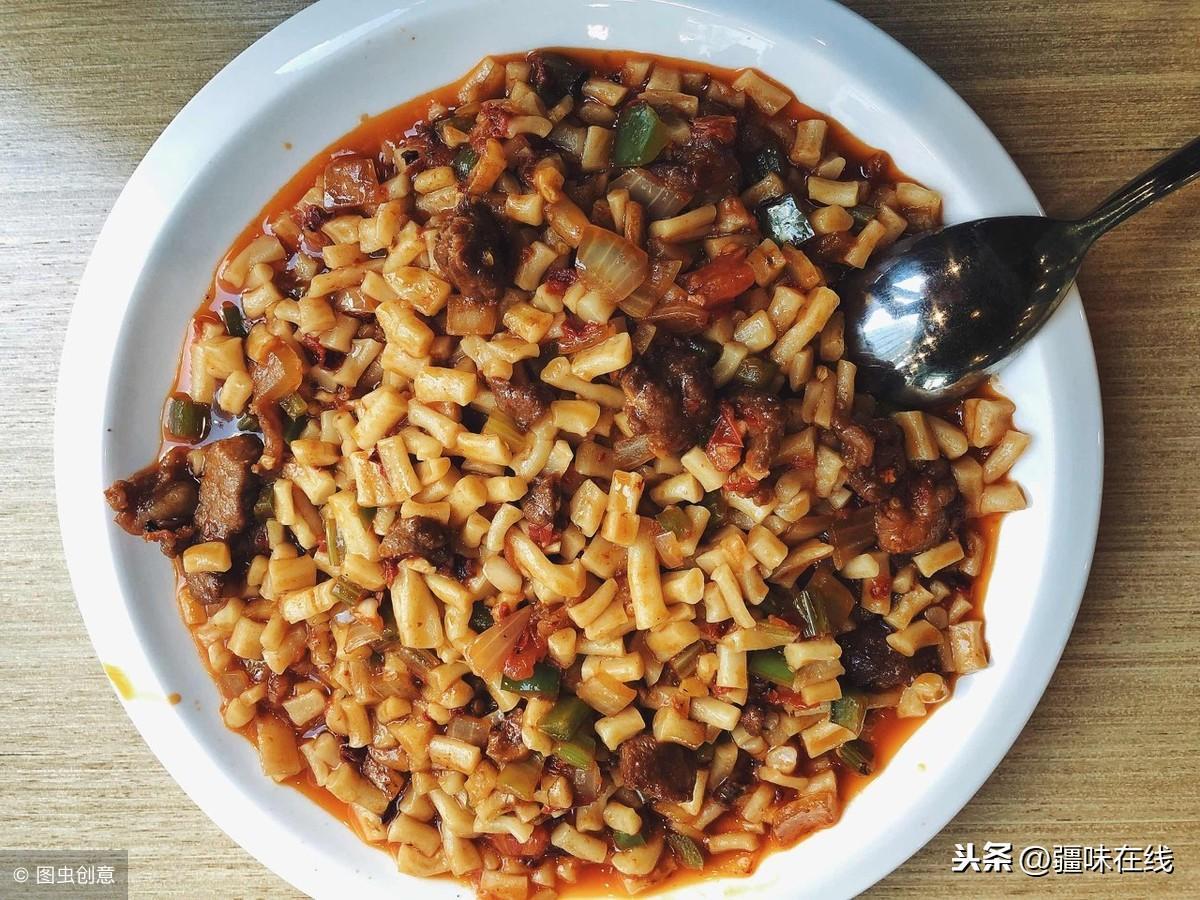 炒米粉 虽是贵州米粉在新疆的衍生物,但十足辣的霸气让每个新疆人不得不为之口水横流。新疆炒米粉吃的就是那个爽字!