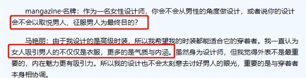 2010年,在一场活动中,马艳丽跟清华教授共同探讨服装设计时,观点充分,理论详实,清华教授连连赞叹,称她服装设计造诣颇高。