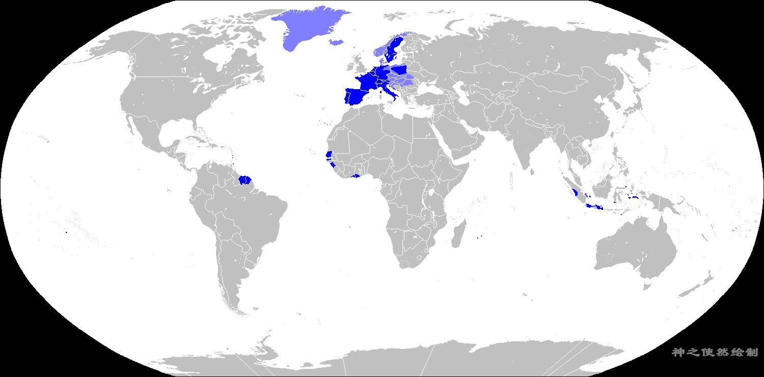 荷兰:1795-1813年;西班牙本土:1795-1807-1813年;西班牙殖民地:1795-1807;意大利(北部):1796-1814年;教皇国:1798-1799、1808-1814年;埃及:1798-1801年;路易斯安那:1800-1803年;奥地利:1805-1809、1809-1813年;德意志地区(除奥普):1805-1813年;普鲁士:1806-1813年;那不勒斯:1806-1814年;波兰:1807-1813年;丹麦:1807-1814年;葡萄牙本土:1807-1813年;瑞典:1810-1812年。