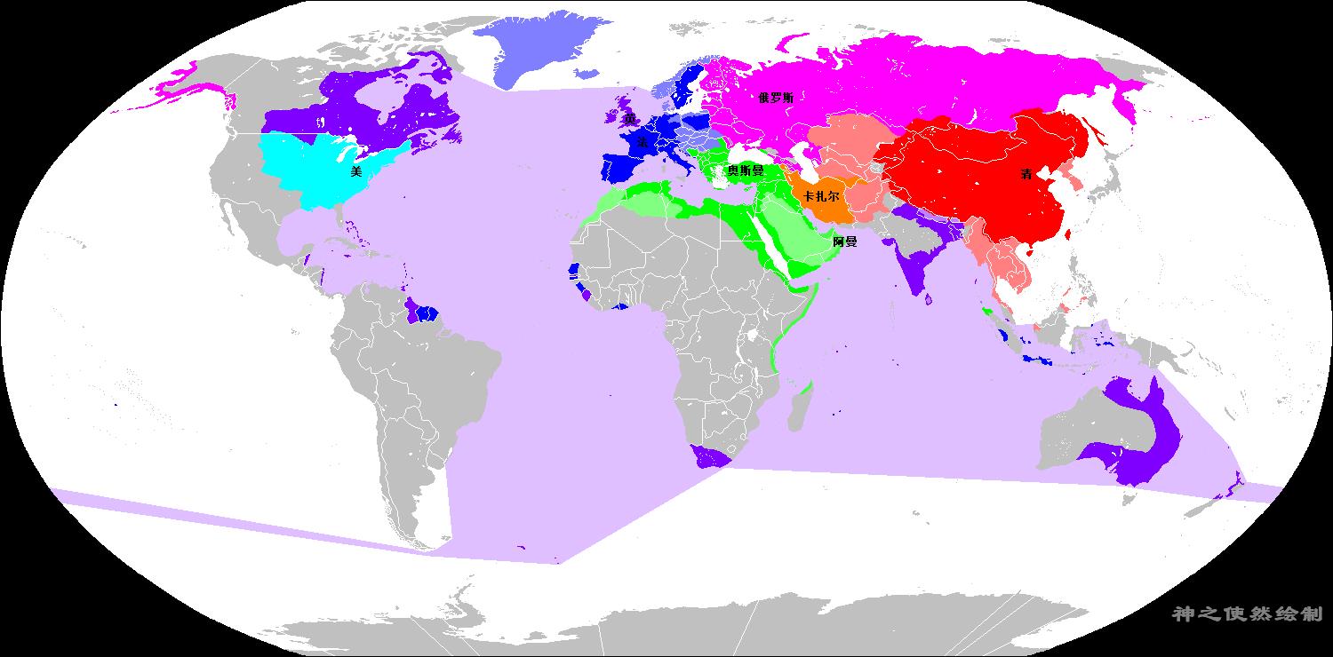欧洲:大英帝国控制着美洲地中海、大西洋、地中海、印度洋、南洋和南太平洋等海域,称霸着全球海洋;俄罗斯帝国虽然保持着独立,但是却处于法国的大陆封锁体系之下;奥斯曼帝国在经历了法土战争、巴巴利战争和英土战争之后已逐渐失去对北非地区的控制力;西亚:丧失东伊朗地区的波斯卡扎尔王朝正与俄罗斯爆发着第一次俄波战争;奥斯曼帝国的藩属国阿曼正进军西印度洋,很快就将与大英帝国在印度洋上分庭抗礼;东亚:大清帝国依然称霸着东世界岛乃至整个世界岛,但是其刚刚经历了川楚教乱,进入了嘉道中衰时期;北美:新生的美利坚合众国陆续从法国和西班牙手中得到了路易斯安那和西佛罗里达,并准备进一步向四周扩张。