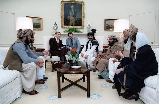 当时的美国总统里根与一群阿富汗自由战士讨论1982年9月发生在洛加尔省的屠杀事件。摄影:Ronald Reagan Presidential