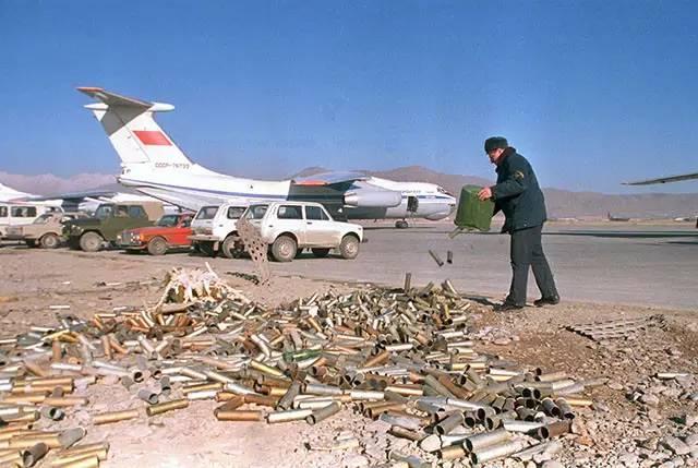 1989年1月23日,喀布尔空军基地,一位苏联空军在倾倒红外干扰弹弹壳。摄影:美联社/刘香成