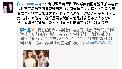 向太,向华强的妻子,在声明出来以后说:“我感觉是金马影展执委会有欺骗巩俐的事实行为!要不然珠宝赞助及珠宝高层为何安排了庆功宴?令到巩俐颜面尽失。她才会如此之说。要不然人家全世界各大影展为何这么认同她,而她从未在乎是否拿奖的。但是她容忍不了人家欺骗她、侮辱她的智慧行为。才按捺不住的直言不讳批评金马奖!”