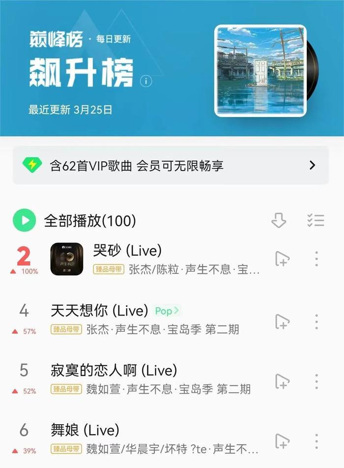 杰哥的歌声不仅感染了在场的观众,也受到了广大网友的喜爱。节目播出后,张杰本期演唱的两首歌曲分别登上了Q音飙升榜TOP2和TOP4。
