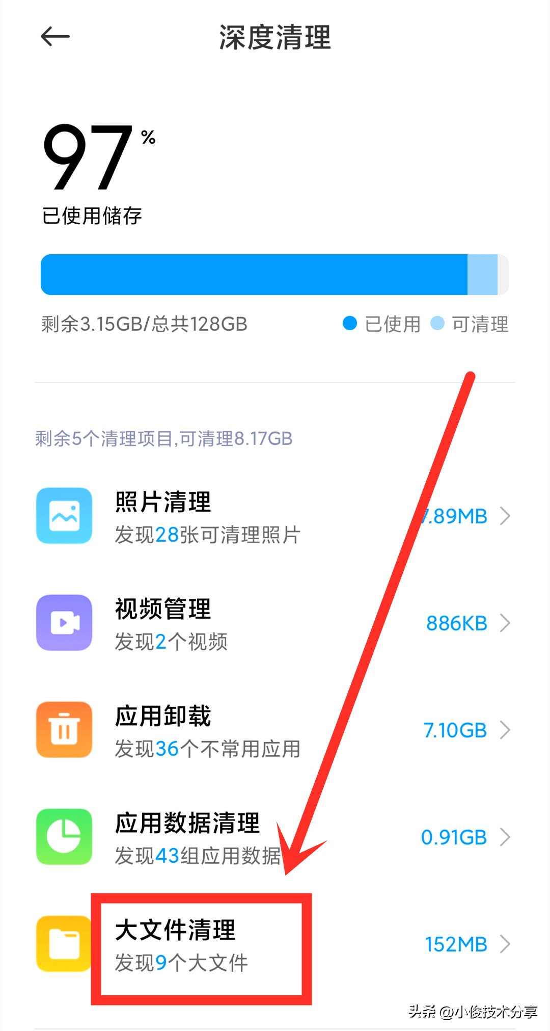 接着找到【大文件清理】,把这些大文件数据清理掉,但是清理的时候需要注意一下,如果在这些大文件数据中有重要的文件,那么你就需要先把它们保存起来,然后在清理,不然一旦清理之后,是无法恢复的!等待清理完这些大文件数据之后,你就会发现手机内存空间已经增大许多了!