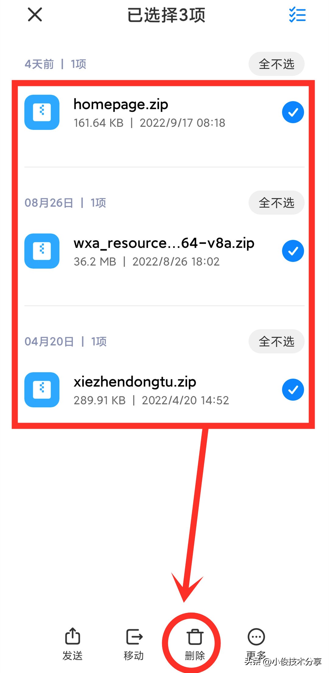 除了清理压缩包文件之外,我们还要把安装包文件清理掉,因为安装包文件也是一样的道理,我们安装完成这个,这个文件对我们就没任何用处了,因此我们也要尽快清理它们,不然它们也会占用手机空间!
