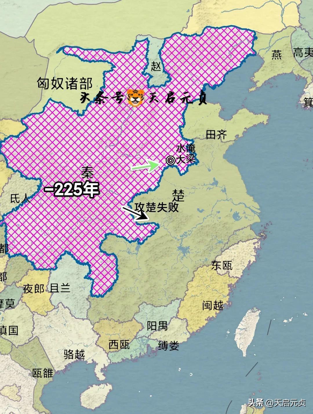 前225年,秦将王贲率10万大军攻魏,水淹魏都大梁,魏王假投降,魏国灭亡。同年,秦将李信率20万大军攻楚,结果先小胜而后大败于楚将项燕,不得不回师。