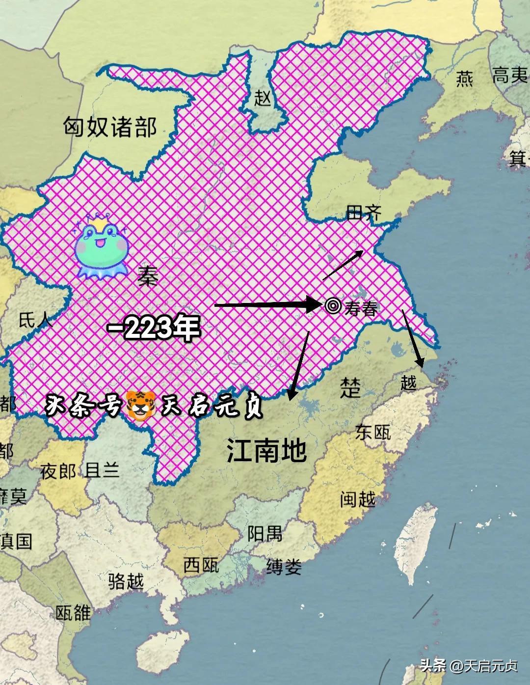 前224年,王翦率60万大军攻楚,在淮南大破楚军,项燕战死,终于啃下这块硬骨头。前223年,王翦与蒙武合攻寿春,楚王负刍被俘,贬为庶人,楚国灭亡。之后,秦军渡江平定楚国江南之地,并降服越君,置会稽郡。