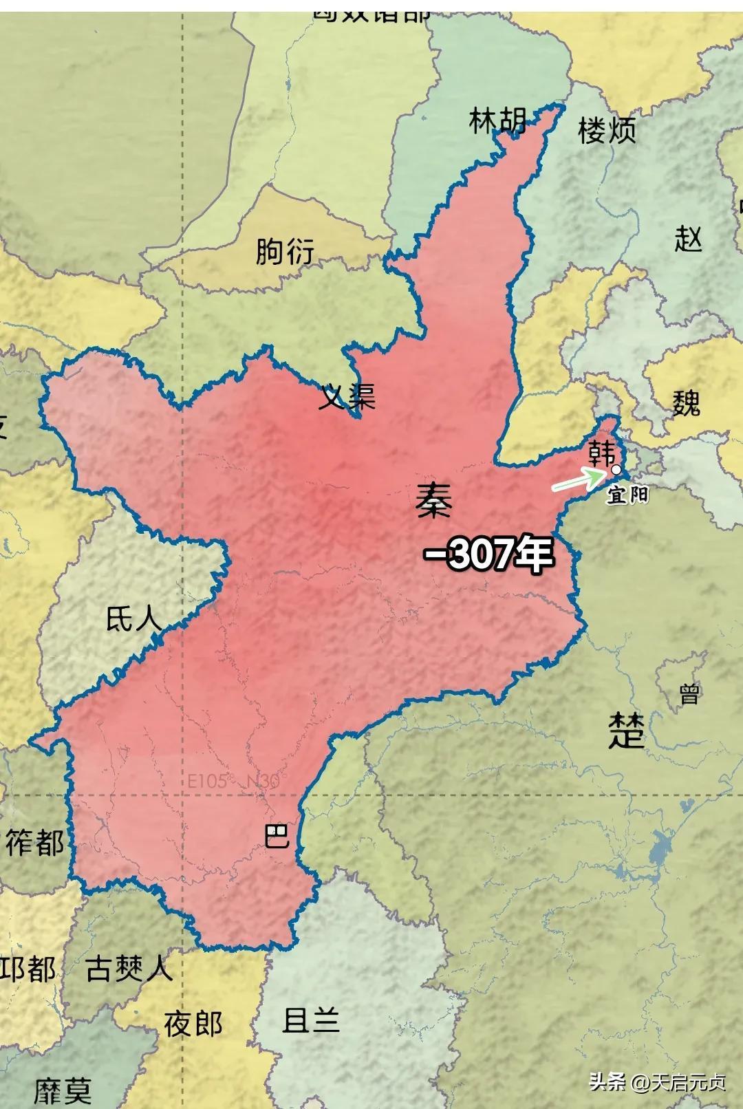 前307年,年幼的秦昭襄王继位,由宣太后和国相魏冉摄政专权。就在秦国东扩事业蒸蒸日上之时,赵武灵王胡服骑射之后,赵国异军突起,逐渐强大起来,成为秦国的劲敌。前306年,赵国在扫灭林胡过程中占领秦国北部,一度对秦国的后方造成威胁。