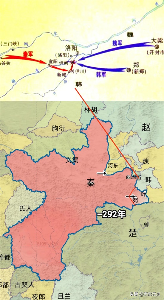 前293年,秦将白起在伊阙之战中大破韩、魏联军,斩首二十四万,攻占韩国南部叶、宛一带。第二年,秦军开始进攻魏国河东,占领王垣。前290年,魏国被迫把河东400里地割让给秦国。