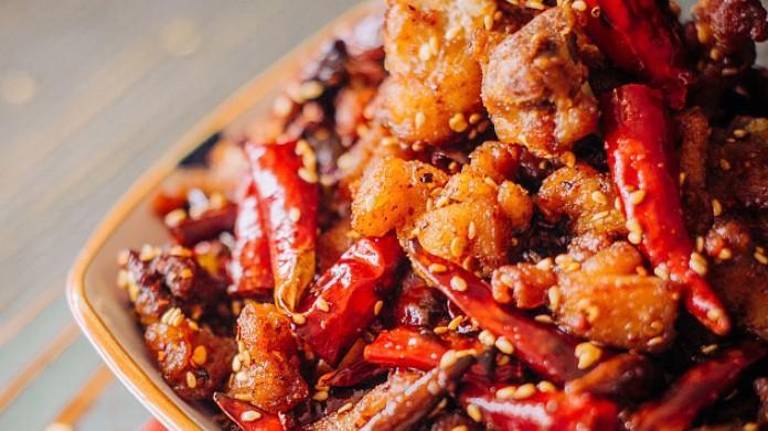 5、锅留底油大火烧热姜蒜爆香,放辣椒段和花椒炒香。