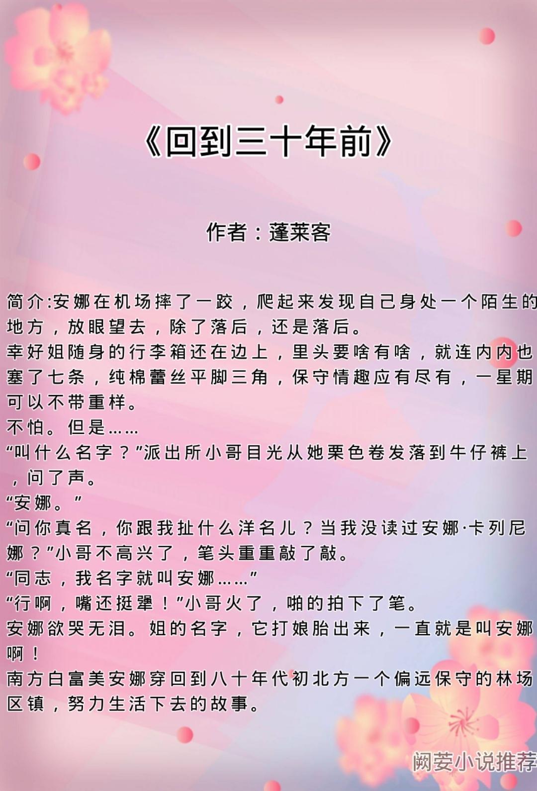 入坑指南:小说女主是个白富美,叫安娜,因为摔了一跤回到那个自己还没出生的三十年前,八十年代初。因为没户口,机缘巧合的去到了北方某林场,打算努力活下去顺便想尽办法认回现在的爹娘。在林场看小卖部偶遇上了男主(陆中军),男主原先是个飞行员,两人最大阻力应该是男主飞行员的职业,因为女主在三十年后是认识男主的,只是那个时候男主早在二十多年前飞行事故去世了,女主知晓未来男主会因为试飞早逝,所以求安稳的女主跟男主吵架(不要试飞)闹矛盾,最后两人在经历了很多以后各自让步。在这过程中不仅找到了自己的父母,还挽救了早夭的哥哥。整体故事流畅,感人,对于七八十年代的北方林场刻画能让人融入其中。