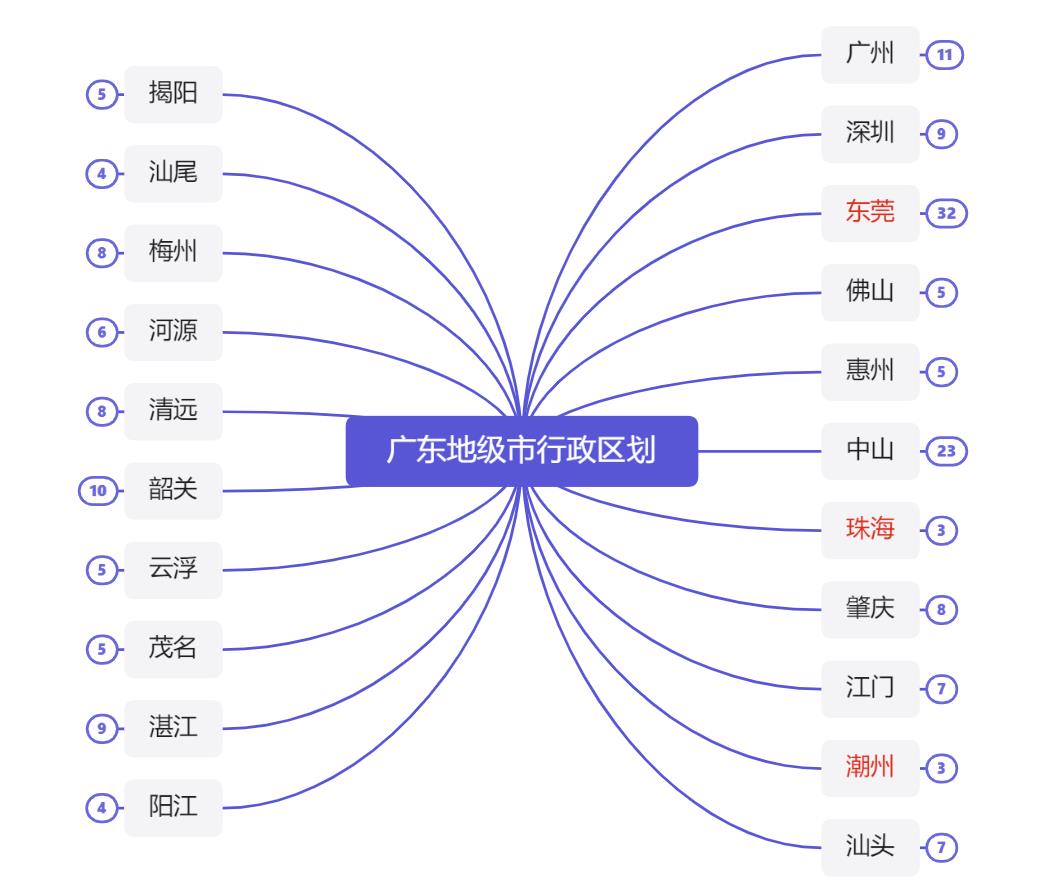 相反,下辖行政区最少的是珠海和潮州两个城市,均只有三个下辖行政区。