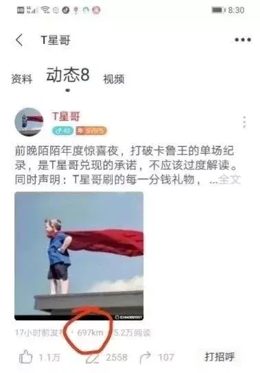 年度过后热度最大的两位神豪大哥我想非寒夜凄凄和T星哥莫属了,昨天陌陌上流再次流传出T星哥招质疑的动态,这玩意其实没啥好讲得,大概意思就是有位叫股份星的陌陌玩家贴出多个图片称T星与琴岛的狼王、何文杰等等主播距离都是一致的!