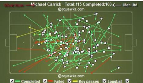 曼联对西汉姆的比赛,卡里克完成了115次传球,成功率90%