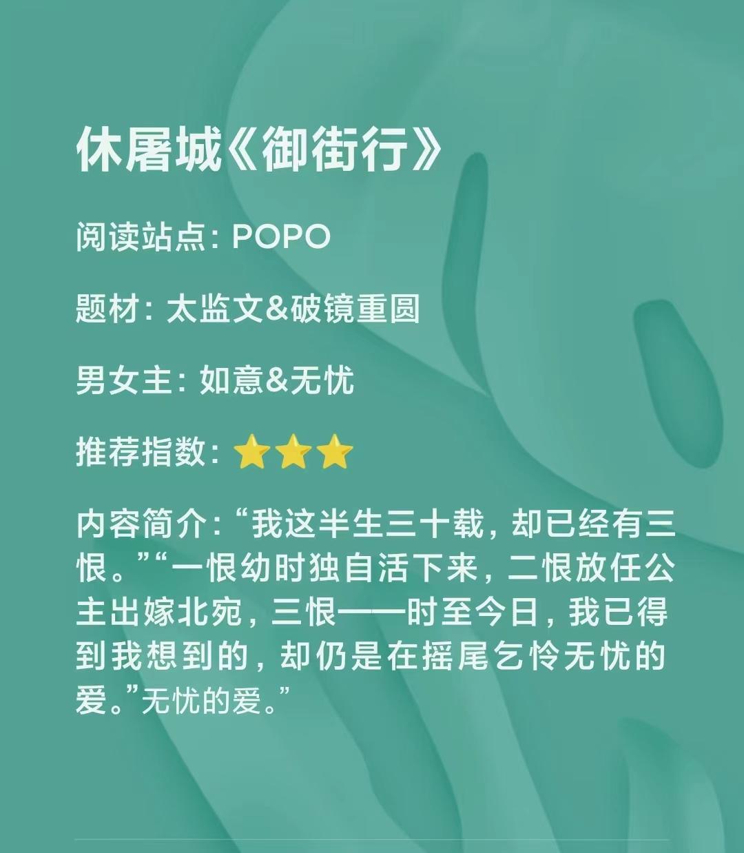 之后,是很长一段时间的不见面,无忧在别国捕风捉影般听到如意从后宫内侍,一步步跃升为前朝秉笔,甚至搅得太后和皇上关系如一团浑水。再后来,今上又未知原因驾崩,无忧亲弟在如意的扶持下继位,无忧不得不回到皇宫。如意要挟她和离,她起先不肯,在爱恨交织中试图轻生,后来在慢慢知晓如意的前尘往事后,才慢慢敞开心胸,结局HE。