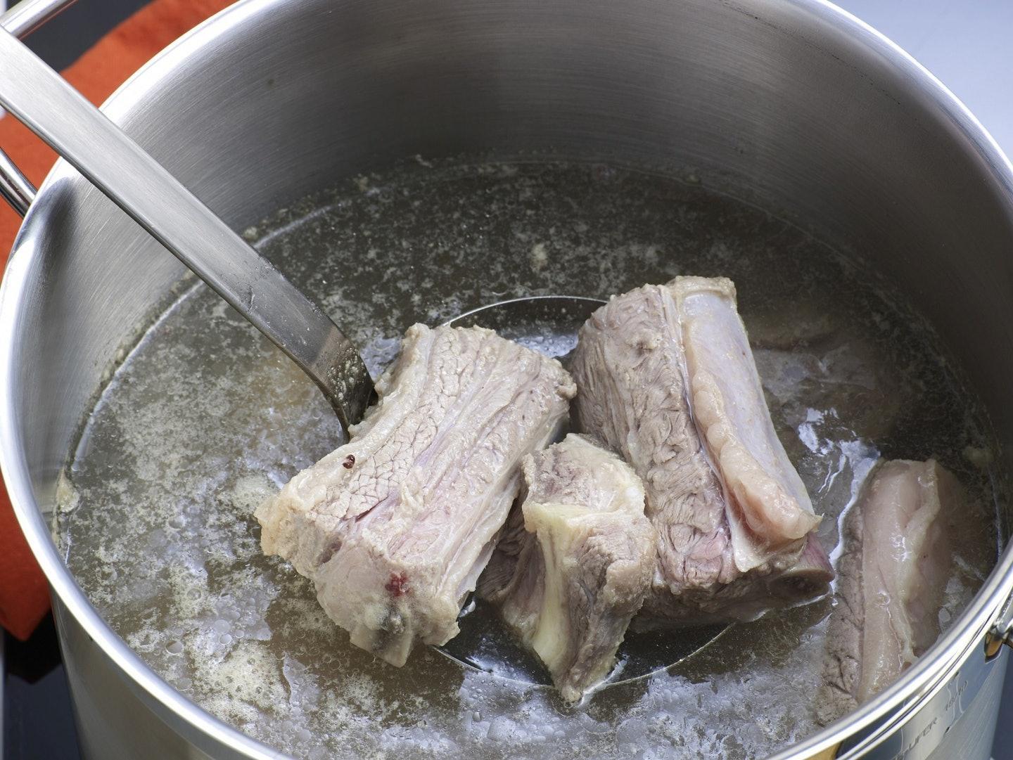2.适用于血水多、异味重或刚解冻的食材,像排骨、猪脚或羊肉等,把藏在细缝中的血污彻底清除。冷水下料,开动中小火,至水差不多滚时,不要大滚,立即捞起食材,煮至肉类表面变熟即可,再以清水冲洗食材的油污及杂质。若是以滚水锅氽水,肉类表面的蛋白质会瞬间凝固绷紧,不利肉内的血水及污物渗出,也无法去除肉的腥膻味。