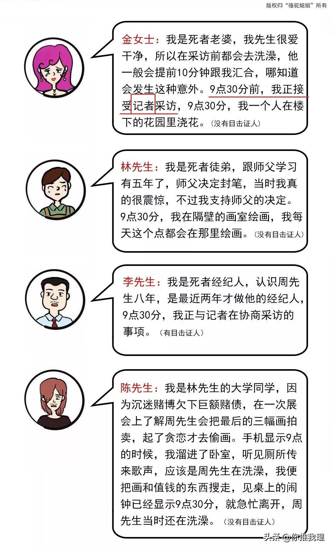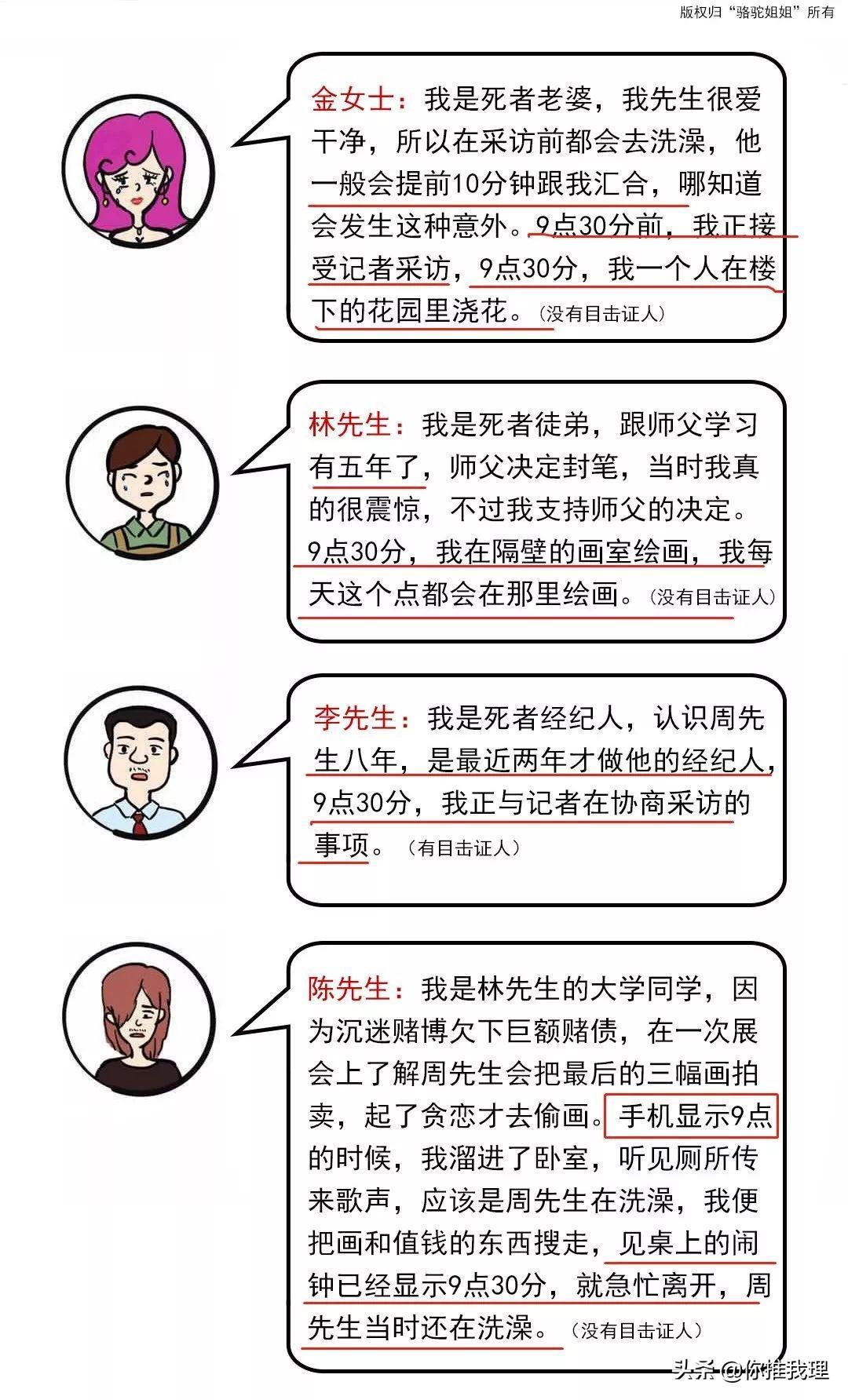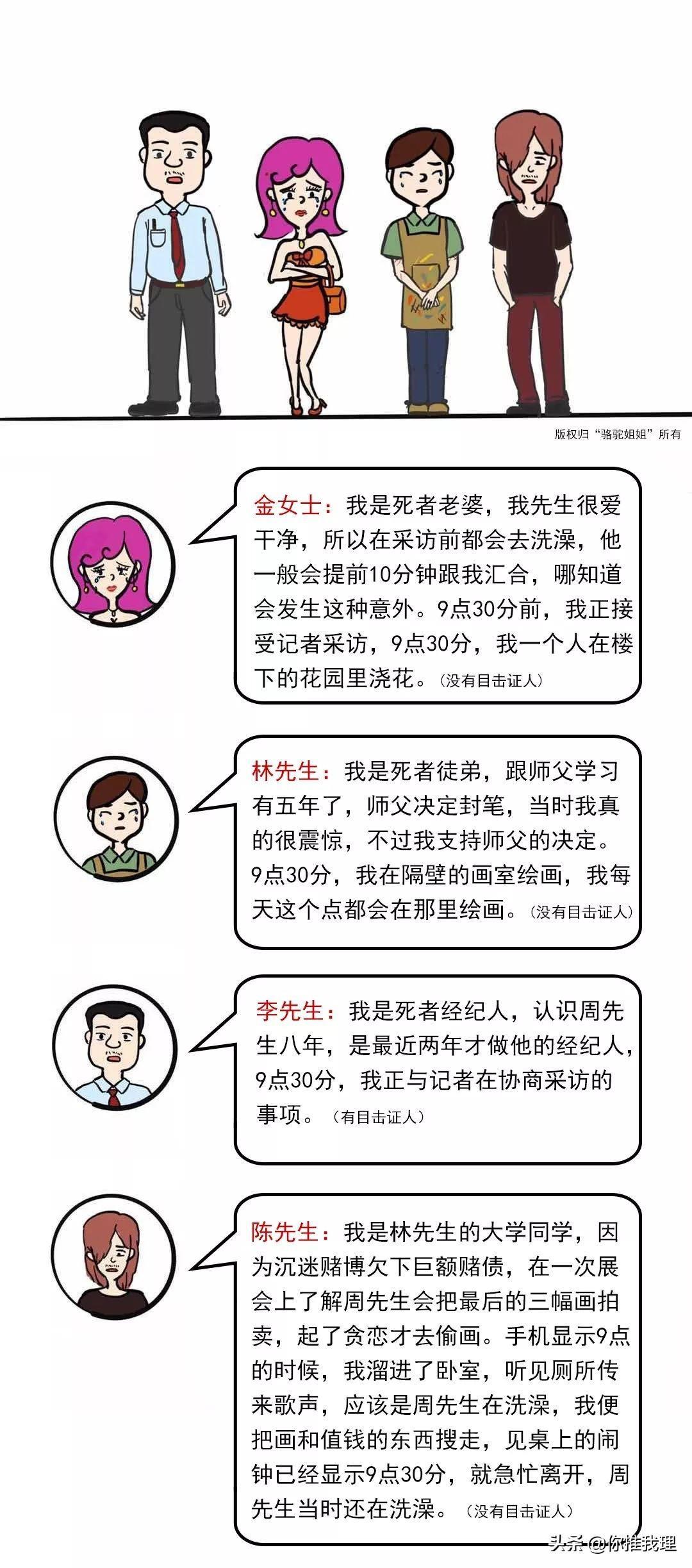 八,前面金女士有杀人动机,却因有证人而摆脱嫌疑,现在嫌疑人仅剩下小偷、经纪人、徒弟 ,为找出答案只能从三幅封笔画下手
