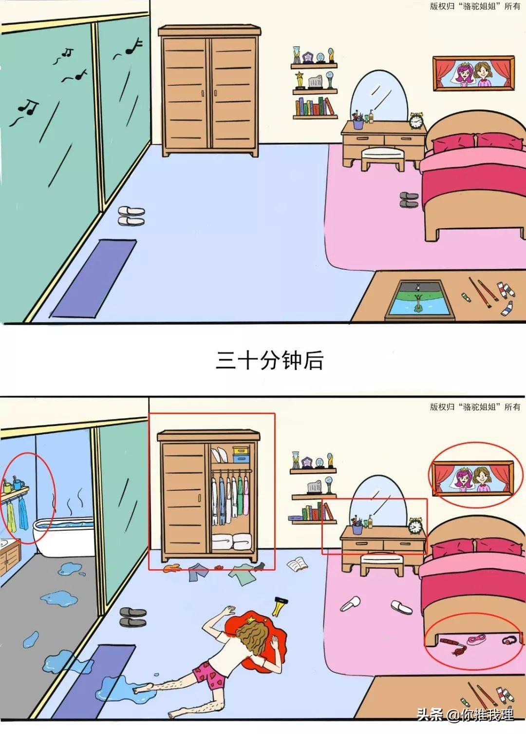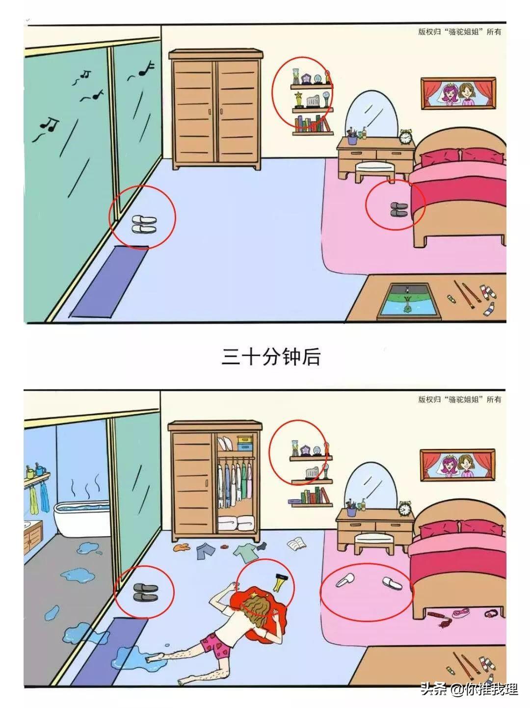1.案发前厕所外的鞋子是白色的,床下的鞋子是黑色的,而案发后鞋子的颜色却相反了!正常小偷不会无缘无故花时间去把鞋子的颜色换过来,也不可能是死者洗完澡穿着白鞋走到床边,再把黑鞋放到厕所旁那么多此一举,应该是死者洗完澡出来,穿白鞋走到床边,凶手突然袭击,死者晕倒(或已死亡)黑鞋和白鞋混淆,凶手为了营造死者在洗完澡不小心滑倒摔到地上的假象,随手把黑鞋放到厕所外。