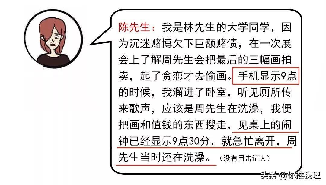 此时你们一定会说为什么小偷要偷画,还把那么珍贵的画弄坏了?是不是在之前画就坏了?可是想想经纪人是不可能把画弄坏的,因为在他确定杀死死者时,这三幅画就是他最后的筹码了,如果死者决定绝笔,同时把丑闻公众于世,那这三幅画便不再值钱了,前面的画也一文不值,为了三幅画可以把人杀了,不可能把画弄坏,相反小偷看见时间已过去30分钟,那种慌张逃跑弄坏画的可能性会大点。