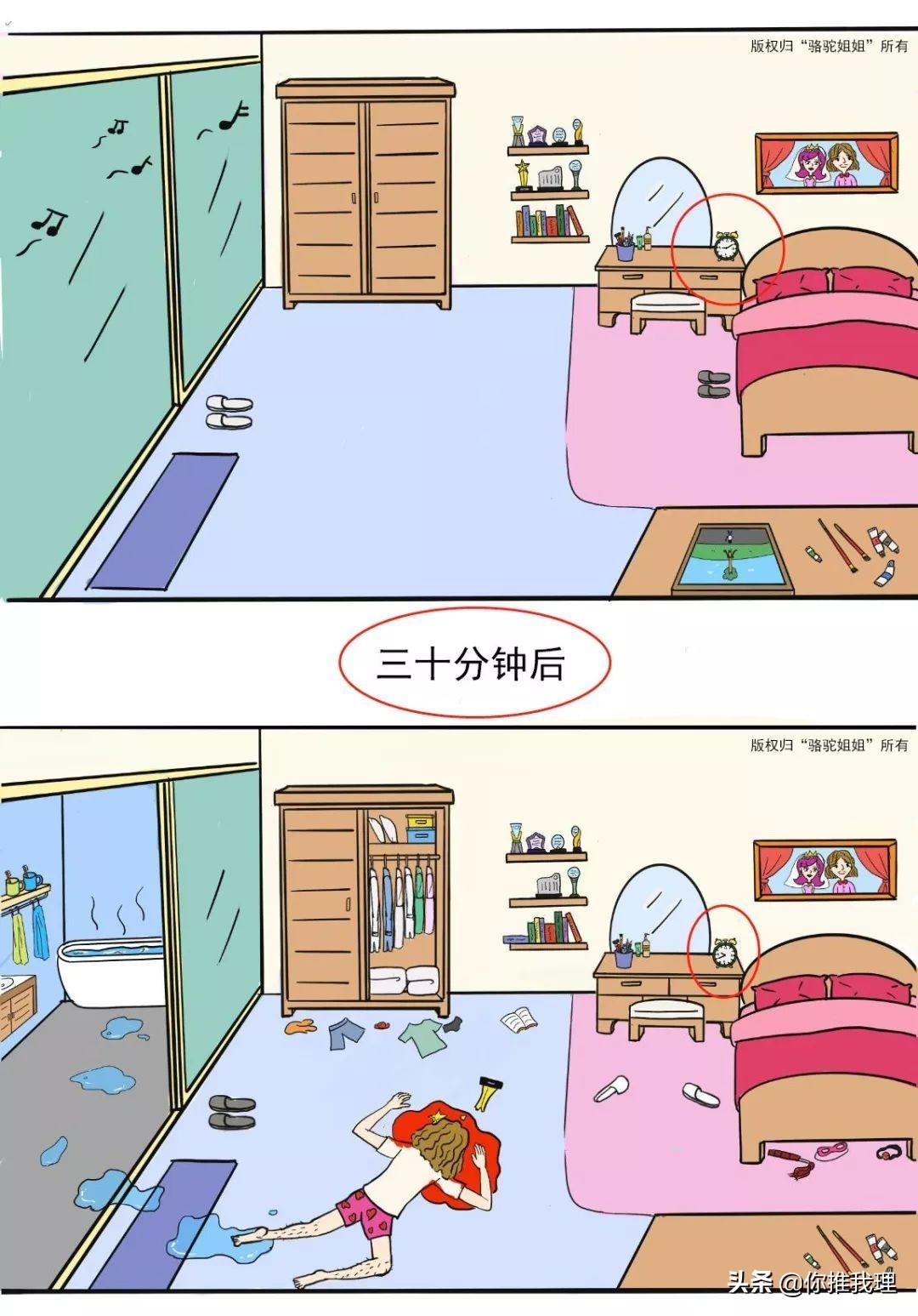 4.手机显示九点小偷进去偷东西,见桌上闹钟显示9点30分才离开,30分钟的行窃?而且死者在9点30分已死亡,为什么还在洗澡?