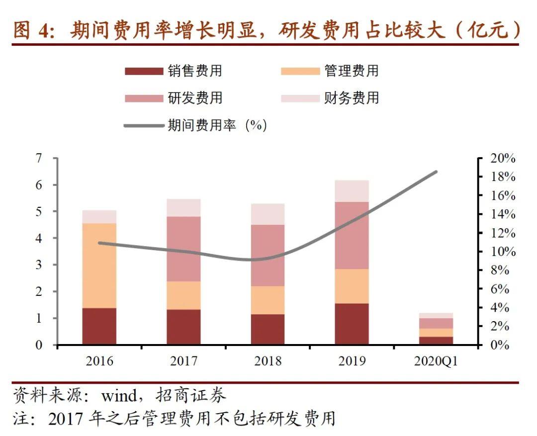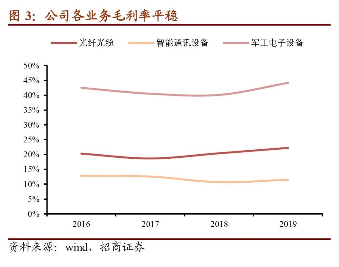 归母净利润去年表现良好,今年上半年发生亏损。2019年公司实现营业收入与净利润分别为46.56亿元、3.23亿元,同比变动-18.4%和17.24%,营业收入下降主要系4G、5G切换期光纤光缆需求放缓以及中美贸易摩擦所致,公司光纤光缆和通信设备两大业务营收减少,但受益于高毛利的军工业务占比上升、公司归母净利润表现良好。今年上半年公司业绩快报指出,因疫情冲击公司订单和产能,公司上半年归母净利润预计亏损3700万元-5200万元。