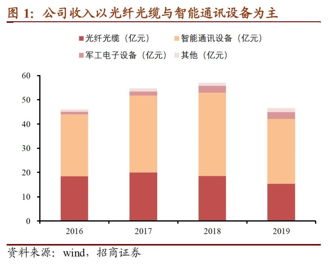 光纤光缆与通信设备龙头,军工信息产业或可贡献增量。公司为多元产业化布局的国企,主业为光纤光缆(33.11%)、智能通信设备(57.51%),近年军工信息产业(6.09%)不断增长,光纤光缆与智能通信设备业务均为国内龙头。2019年公司实现营业收入/净利润分别为46.56亿元/3.23亿元,同比-18.4%/17.24%,过去3年公司光纤光缆与通信设备产能并未增长,而受行业需求下滑、产能利用率均下降(其中光纤光缆产能利用率仅50%),导致收入下滑,相对高毛利(40%~50%)的军工信息业务则成为近年来公司利润增长的贡献者。当前光纤光缆仍处于周期底部、整体上供过于求,低端产能仍在不断出清,未来或随着5G建设带来光纤光缆需求的增长迎来反转;智能通信设备领域则随着互联网接口承接5G红利,需求有望进一步增长。但短期来看,公司业绩增长仍依赖于行业景气复苏带动产能利用率上升,目前尚未看到明确拐点。
