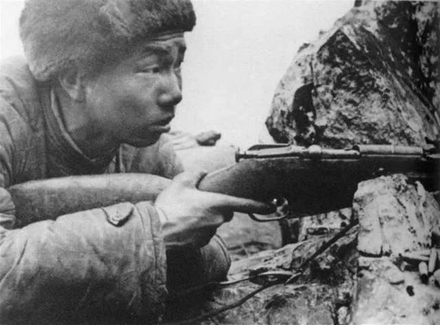 志愿军狙击英雄张桃芳在阵地上。