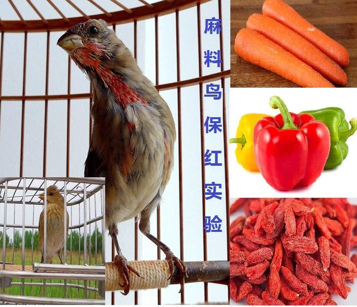 鸟友在实验中,长期喂养麻料鸟胡萝卜、甜椒、枸杞,麻料鸟出现了比较理想的保红效果,无论是青麻料公鸟还是红麻料,在换羽期间,颜色都变成了红色,而这三种食材经实验证明全部富含类胡萝卜素,类胡萝卜素在鸟体内的沉积过程则要求饲养者必须长期投喂。
