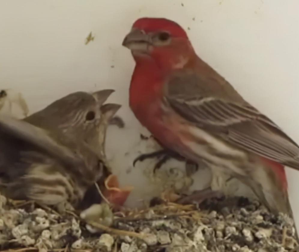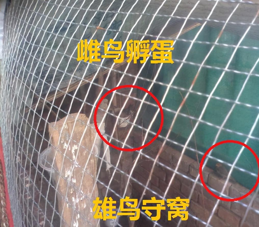 国外拍摄的麻料共同育雏的场景,红色为公,青色为母