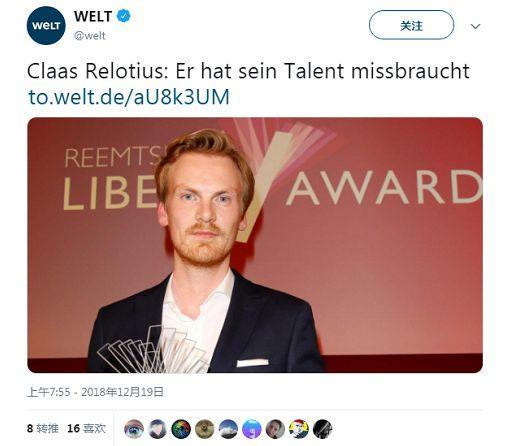 然而,颇为讽刺的是,这位年仅33岁的明星记者在二十多天前,因一则叙利亚男童的报导刚刚被授予德国年度记者奖。除此之外,他还是2017年“欧洲新闻奖”及2014年“CNN年度记者”获奖者,可谓是德国媒体界“一颗冉冉上升的新星”。