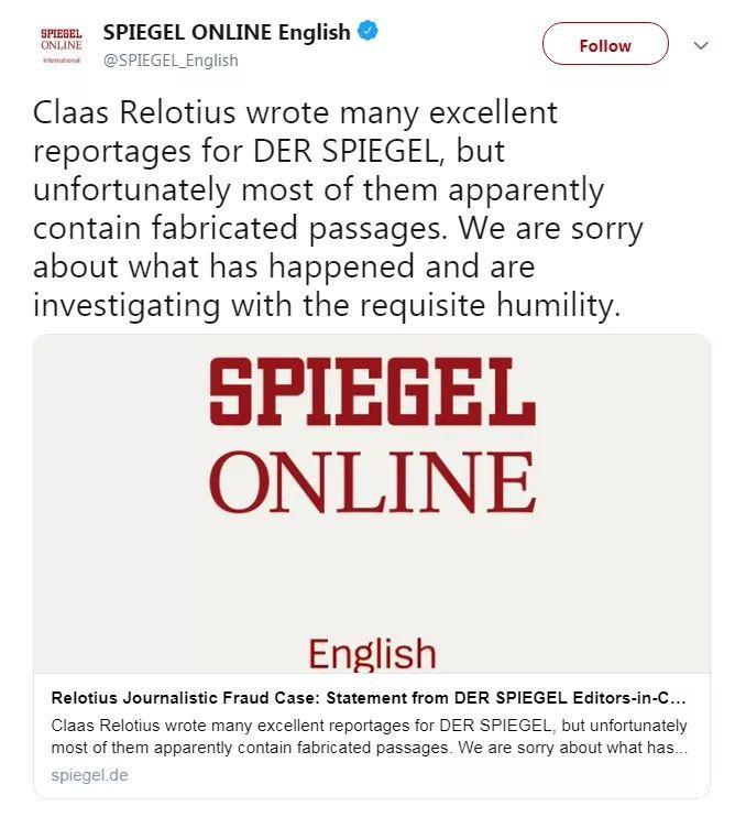 德国精英媒体品牌《明镜周刊》爆出新闻造假事件,明星记者雷洛蒂乌斯(Claas Relotius)因至少在14篇新闻报道中涉嫌捏造事实和造假被宣布解雇。