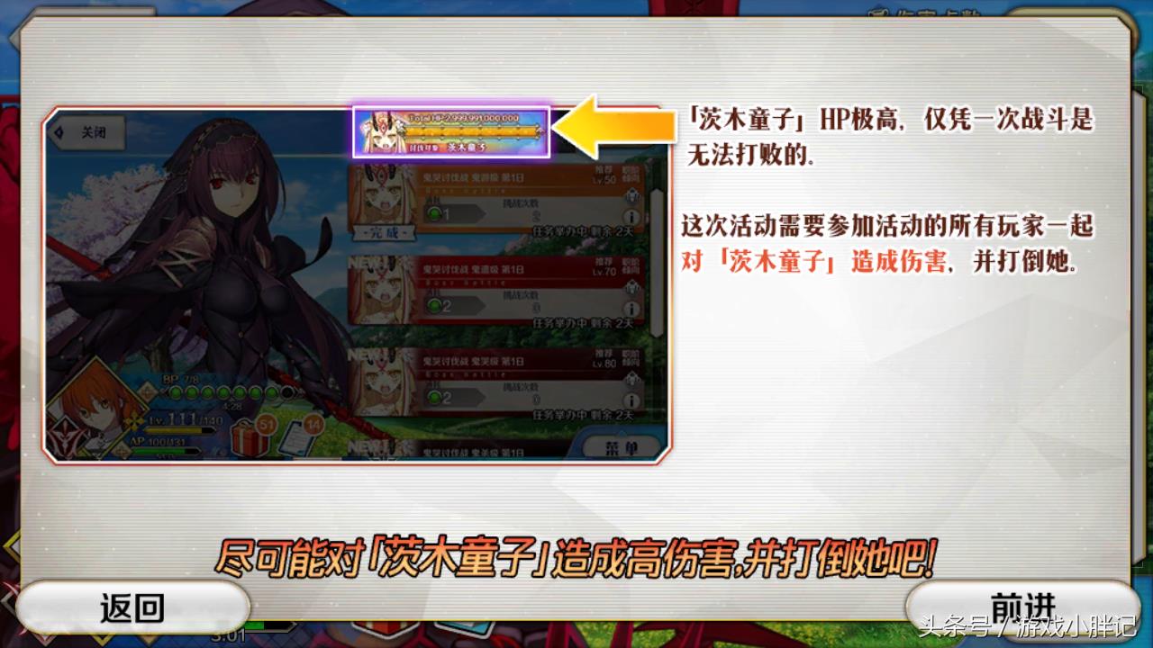 值得介绍的这次的活动和上次时间神殿是一样的,都是依靠全服玩家一起攻略的,请给位Master一起努力讨伐茨木童子吧~!