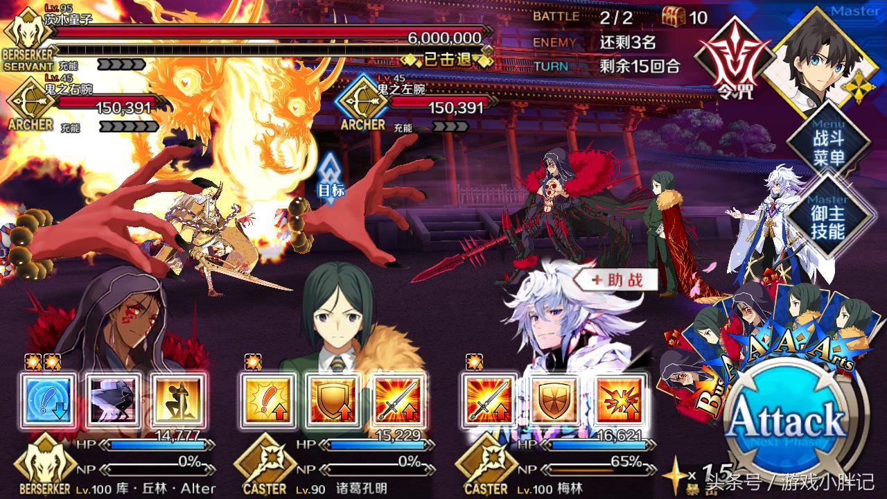 因为这次活动是不讲究输赢的,就是打出伤害点数就行,上黑杯也行,就算全灭也没关系,所以上三个Berserker也是可以的,盯着茨木童子死捶就行了。(茨木:我惹谁了额。。)