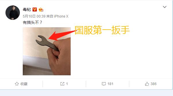粉丝们也说毒纪膨胀了,带妹的级别都变高了,开始和女主播排了。而近日毒纪却又发了一条很莫名其妙的微博,微博内容就是一张扳手的图片。于是这张图片引起了网友们大胆的猜测。