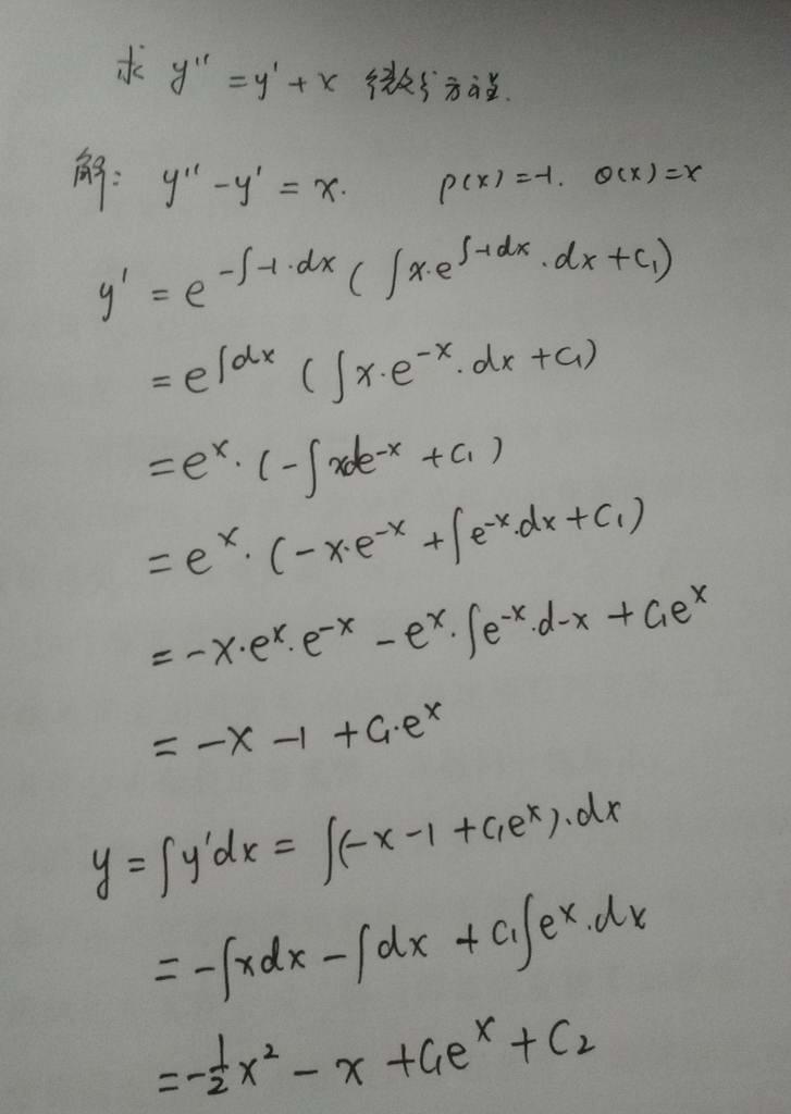 y''=y'+x,此时先对y'按照通式公式来求解,再对y'积分求解得到y,通解中含有两个常数系数c1和c2,此时P=-1,Q=x。
