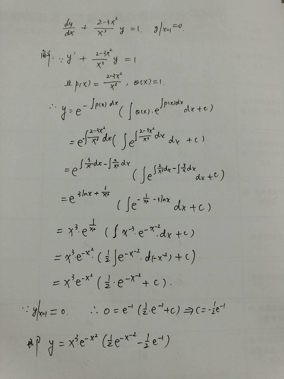 本例中p(x)=(2-3x^2)/x^3,q(x)=1,求满足y(x=1)=0时的特解。